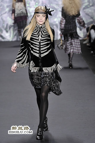 在后台,Anna Sui谈到了她本季的主题:新艺术运动、拉菲尔前派、蒂凡尼的花瓶、丝绸碎褶、古斯塔夫•克里姆特,对了,还有西北太平洋地区的美洲印第安人。一场美丽的大杂烩?也许有些人是这样认为的。