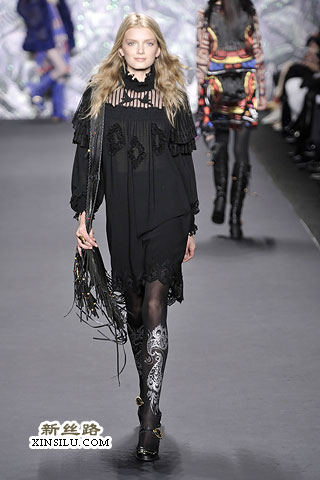 在后台,Anna Sui谈到了她本季的主题:新艺术运动、拉菲尔前派、蒂凡尼的花瓶、丝绸碎褶、古斯塔夫•克里姆特,对了,还有西北太平洋地区的美洲印第安人。一场美丽的大杂烩?也许有些人是这样认为的。