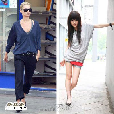 宽松的大V领针织衫,搭配紧身内搭单品,MOSS的搭配是临近色的搭配,轻松随意。模特儿的搭配是撞色的搭配,随意中又透醒目。