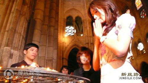 有趣的是,林志玲在圣母院里特别停留在一座圣像前点蜡烛祈福。