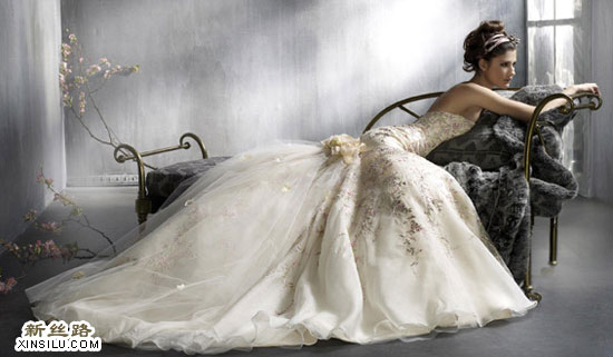 2008婚纱的流行趋势是集体告别了前几季的清凉性感,象是裸肩无带的裹胸式婚纱在2008年终于退出主角位置。2008春夏婚纱将薄纱、蕾丝、刺绣、缀珠等流行元素重新组合,塑造出新娘的端庄新形象,典雅兼具时尚感。