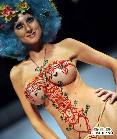 时尚设计师的创意层出不穷。日前在好莱坞举行的时装秀上,模特们一丝不挂地展示了由Bullet 4 Peace设计的奇特时装艺术。模特们裸体后被彩绘上各式图案。