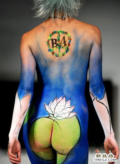 时尚设计师的创意层出不穷。日前在好莱坞举行的时装秀上,模特们一丝不挂地展示了由Bullet 4 Peace设计的奇特时装艺术。模特们裸体后被彩绘上各式图案。