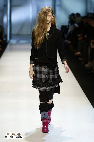 手臂藏在特大型的服装和外套里,反衬出这些服装像是约束衣,模特们—发型梳得歪斜着,帽子耷拉着(掉在T台上了)。多层的上衣随意着搭在身上,费尔岛式的腿罩给脚踝蓄存了温暖。