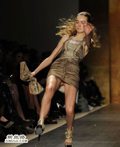 2月13日-15日,在纽约时尚周上,不断有模特走秀时出现尴尬镜头,或者把鞋走丢,或者失足走光。