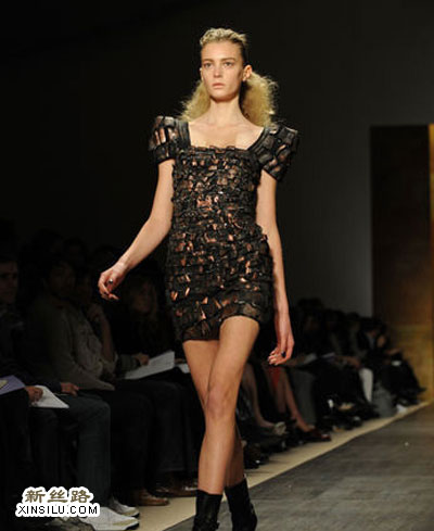点评:MINI的长度与略带金色的棕色连衣裙,设计师的灵感是否出于大森林的感觉呢?遍布于裙身的“鳞片”像树皮一样。