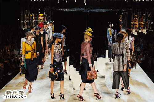 伴随着George Gershwin的《蓝色狂想曲》缓缓响起,一位斜戴着扁礼帽的模特从镜子后面走了出来:格纹衬衫外搭了一件收身短衣,贴金布面的高腰裙在膝盖下自由的散开,模特就像一名穿越时空的摩登村妇。Marc还在其中穿插了美式风格和东方痕迹。繁复的配饰也是这场秀的看点,Marc Jacobs巧妙地将这些元素结合在一起营造了一场斑斓的梦境。