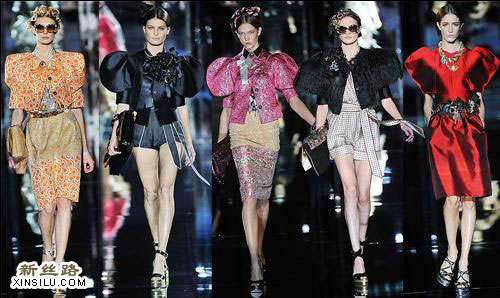 Dolce & Gabbana 今年的肩部有各种几何造型,模特的胸部两旁茁壮得夸张,规则却不多见的圆形、古怪的多边形和蝴蝶翅膀形状的肩部到处都是,这种肩部设计师的好处是,所有的视觉重点全部被吸引到上半身,下半身无论如何不必作任何夸张或抢眼的打扮才对。