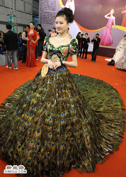 当日,一件由苏州8位工艺师耗时两个多月制成的孔雀羽婚纱,在南京首届婚庆文化博览会上亮相。这件缀有2009片孔雀羽毛的婚纱,配以和田玉饰,艳丽华贵。