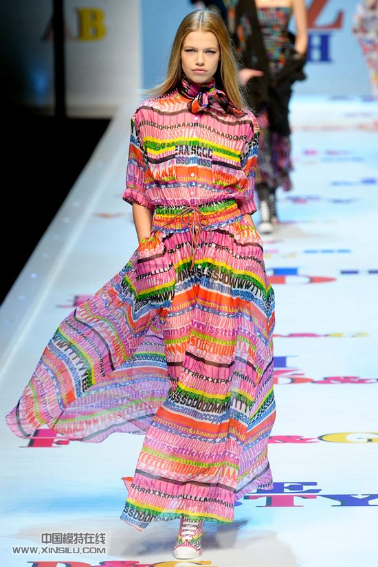 D&G——字母装 本季米兰时装周D&G新品发布会上,冬日色彩完全消失。D&G为我们带来了一场色彩盛宴,秀场变成了被打翻的调色盒和字母表。纯度高而又高的明艳色彩被一组组排列或有序或散乱的字母切割,令人目眩神迷。毋庸置疑,时尚界马上会被一股字母潮所冲击。
