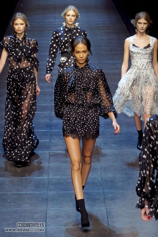 Dolce&Gabbana——满天星 2011秋冬米兰时装周上,时尚界迎来了最受关注的Dolce&Gabbana 2011/2012秋冬女装发布,满场闪烁的星星、音符图案与彩色亮片,此场女装秀变成了热闹的摇滚舞台。无论是轻盈飘逸的长裙还是简洁时尚的套装,甚至连配饰都是闪闪发光的星星图案。