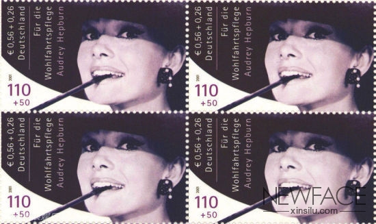 2010年10月16日以43万欧元拍出的德国未发行“赫本”邮票的版票已被撕开,其中右上角带边纸的一枚(见图)于6月10日在瑞士巴塞尔经Galerie Dreyfus拍卖行售出,成交价为12.6万欧元。