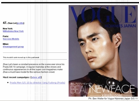 赵磊登上models.com男模排行榜Top 47