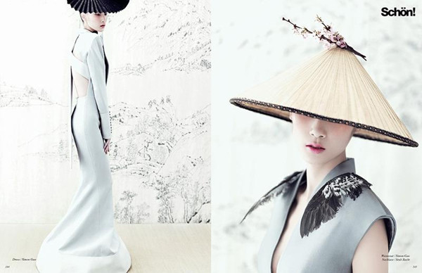 头戴草笠的薛冬琪,在中国宋代山水画的背景下,演绎写意般的中国风情。素白与蓝黑的双色搭配,简洁流畅的线条,配以最纯净的色彩,在和谐禅意中烘托淡雅般的静好,美得无懈可击。薛冬琪,来自新面孔2011年高考班的国际超模,向来以她最具东方化的美征服国际时尚界。