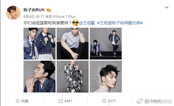 陈子由发微博“挑衅”王祖蓝,要和王祖蓝比谁帅(图)陈子由发微博“挑衅”王祖蓝,要和王祖蓝比谁帅(图)