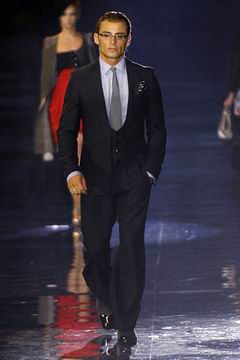 Armani春夏新装正是此一特色的融合,主要颜色相当抢眼,比如白色、红色与黑色,加上几何图案、Z字型的抽象艺术等,让整个系列更为丰富。至于有关Armani折衷的部分,则是多种层次的灰色出现,烟熏灰、沙子的灰等配上银色,低调中也显露出华丽的特色。