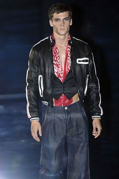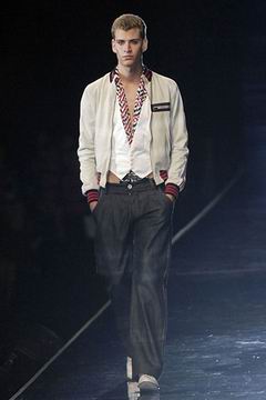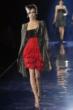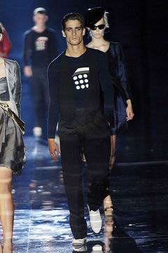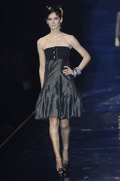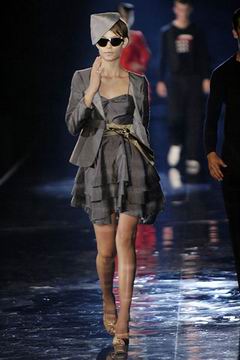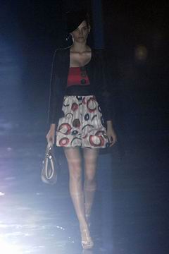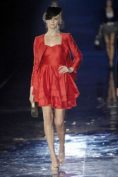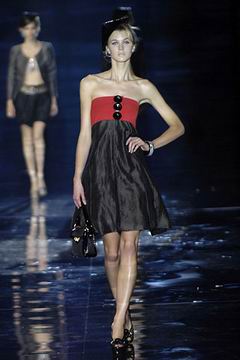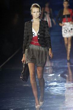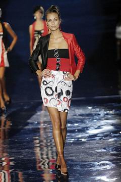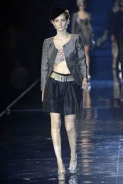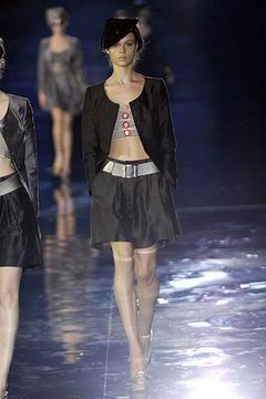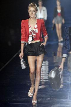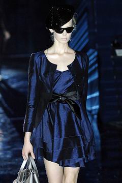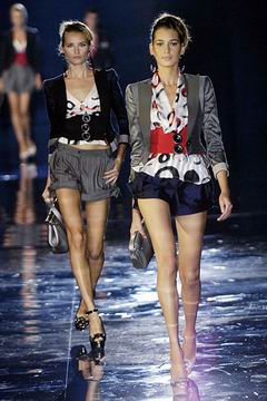 整个系列中,裙装都是清一色的短,约在大腿中段的长度,而Armani也在整个比例上略做调整,让裙装看起来更有特色,再加上缎带装饰的裙摆,另外低腰剪裁的百慕达裤、长裤等穿插其中,也有一股休闲特色。对Armani来说,女人的腿部线条是相当有吸引力的,配上高跟鞋、平底鞋款或凉鞋等,让女性自在的搭配美丽服饰。至于在整体轮廓上,皆以合身线条为主,帽子也占了相当大的比例,搭配精致剪裁的短版夹克、极度女人味的上衣,亦古亦今,正是Armani的最大特色。至于Armani极富特色的晚装部分,女人味当然是重点,但他还混合了男性的背心,搭配山东丝绸的长礼服,而充满夏日风格的泳装也搭配了有带子的上衣,彷佛就是为了一场悠闲的度假所设计,随时随地穿去泳池畔或海滩旁,都是最亮眼的时髦女郎。