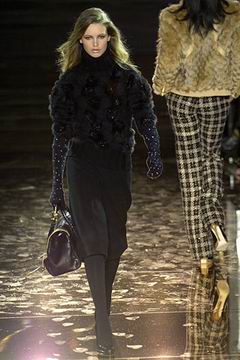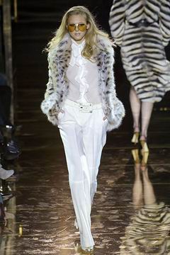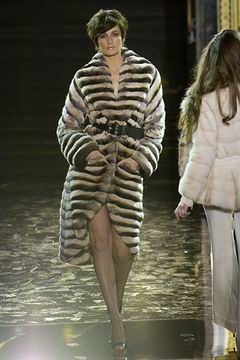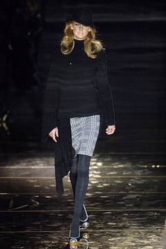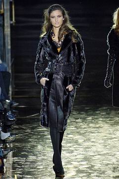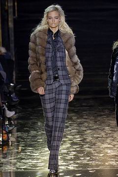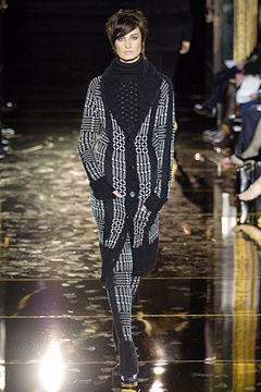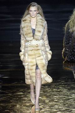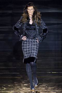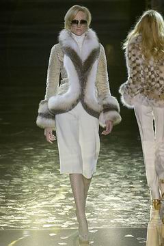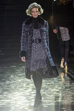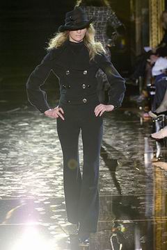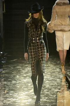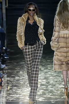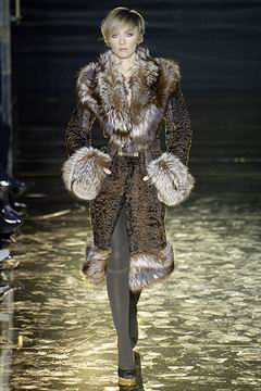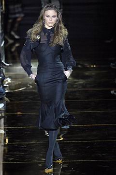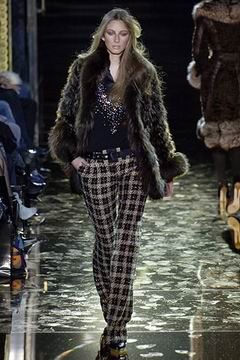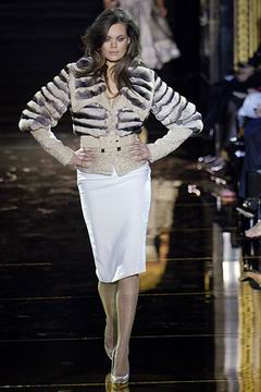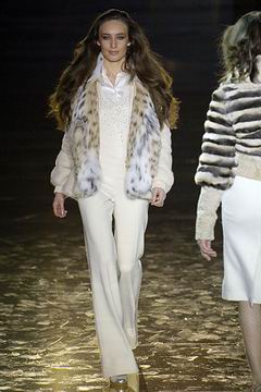 今年的Macdonald秀集结Donatella Versace的淑女风范概念与VOGUE杂志1916年12月号阐扬的皮草理念,将皮草运用在本季发挥极致,就像重现当年最红的54俱乐部夜晚的入口一样,出现的模特儿都是穿着时髦的皮草外套、带着遮住半脸的大墨镜、穿着鱼网丝袜足蹬六寸露趾凉鞋。本季着重于使用彩格呢,以它作成洋装、套装、或是窄板及膝裙等…这种格纹料子放眼之下,也只有少数如Macdonald可以把它玩得如此性感。另外的作品像是上半身极为合身性感、下襬以羽毛或孔雀毛装饰的鱼尾造型的礼服、或是紫色及地晚装等…都是让人惊艳的闪亮之作。最后当穿着白色婚纱的Paris Hilton与穿着红色宫廷式军装外套的Macdonald联袂走出来时,让人有种已不在时装秀现场的错觉,闪耀的烟火与满天纷飞的金色纸片,不禁莞尔的联想到一场欢愉盛大的时尚婚礼。