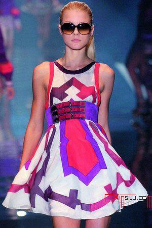 今年的腰带决不中庸,硬朗中性的黑色皮腰带似乎就是要挑战柔美娇媚的气质,在冲突碰撞中凸现大女人的风采。更特别的是今年的宽腰带还起到廓形的作用,系在胸部以下腰上一点,将松身的裙子变成本季流行的高腰A字裙,拉长了腿部线条。