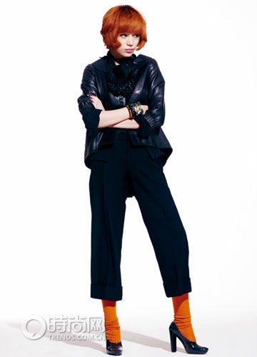 5% :一双彩色的袜子就能打破所有暗色的沉寂给服装增彩 黑色翻领薄纱衬衫Celine 黑色内衣Cotton Club from Innee 黑色短风衣Louis Vuitton 黑色九分裤Marni 橘色袜套Prada 深灰色蛇纹漆皮鞋Louis Vuitton 镶宝石宽手镯Loewe 黑色装饰项链Marni