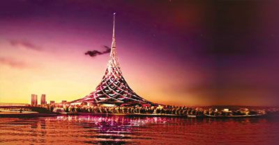 俄罗斯首都莫斯科计划斥资20亿英镑兴建全球最大型建筑物,起名“水晶岛”。水晶岛以“楼中城”的概念为主,可容纳3万人,将成为全世界楼面面积最大的建筑物。水晶岛楼高差不多1500英尺(457米),比当前香港的最高建筑物国际金融中心二期(416米)还要高。