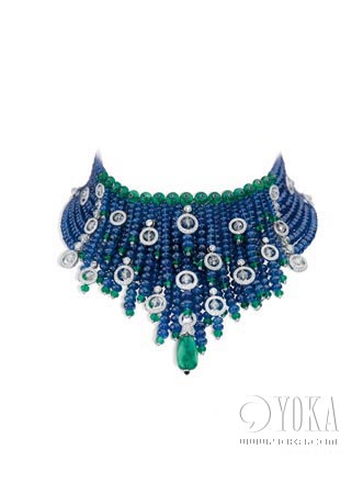 近1100克拉的深邃蓝宝石、祖母绿珠串,搭配着40多克拉的明亮型切割钻石及钻石珠子,与4颗玫瑰形切割的钻石及1颗13.68克拉的水珠形切割珍贵"哥伦比亚"祖母绿一起,展现着宝莱坞式的奢华梦幻。莲步轻移间,华贵的宝石和钻石互相轻快地低语,自由地舞蹈,散发出无限活力……