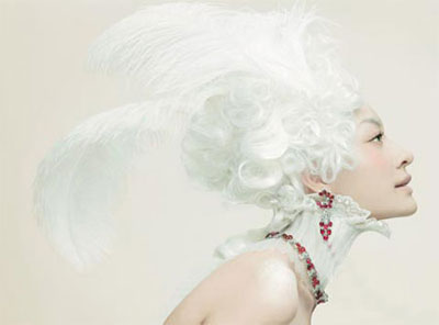 雍容华贵的驼鸟羽毛和精致高耸的白色假发,这些宫廷奢华的“白色宣言”将红宝石光彩衬托得更加纯净。