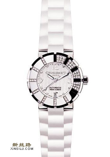 绰美的Class One白色自动表,防水功能100米,抛光精钢的单向旋转表圈上镶嵌了钻石。
