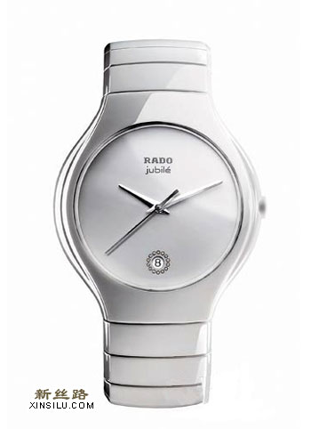 雷达的真系列纯真钻系列,表壳和表带采用白色高科技陶瓷,表盘上日期显示窗周围环绕14颗钻石,纯白的色泽尽先优雅。