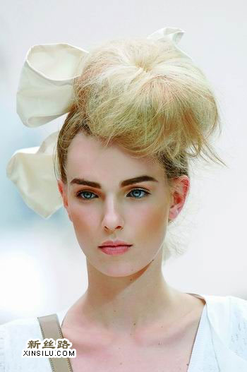 “有悖于Moschino上一季柔顺的直发风格,这一次我想玩点形状上的变化。我希望用夸张的造型重新诠释上世纪40年代的经典风格,但是我会用自然的手法,尽量不经意地表现出来。”每个参加这次走秀的模特头上都要顶一个超大号的发髻,就像扣在头上的一顶女式小帽,并在旁边配上一个大大的白色蝴蝶结。我们同样可以在参加Party时借鉴这个发型。先把头发扎成一束马尾,然后将辫子向前梳固定在头顶前方,再分成两束。将两束马尾的发梢翻过来,分别用发夹固定在马尾根部,最后挑出几缕头发自然垂下即可。