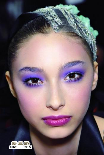 “当我看到Christian Lacroix的华丽秀场后,我脑子里就闪现出了这个造型。因为我必须找到一种妆容能够配合这场秀中所有的颜色以及衣服上的印花。紫色是这个造型中的一个亮点。这是一个出跳而妩媚的颜色,能够让人眼前一亮。”为了避免让这个妆容看上去显得无精打采,最好搭配淡紫色的眼影以及亮粉色的唇彩,而不要使用淡粉色。