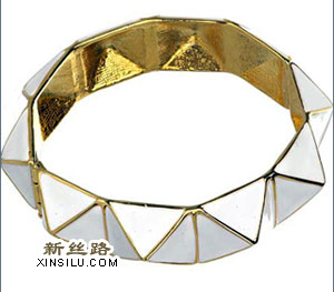 充满几何感的造型借鉴了70年代Punk的经典元素——方钉,用金色的线条在白色珐琅的表面切割出华贵的印记,这无疑提升了手镯的视觉感,简单典雅的配色中却蕴涵着一种不肯流俗的平民精神。