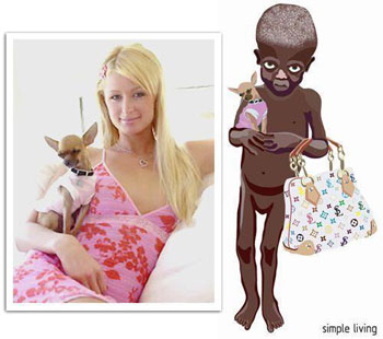 一个瘦骨伶仃的裸体黑人小孩一手抱着吉娃娃(让人一眼想到千金小姐Paris Hilton时常抱着的那只),还有一手提着一只颇似LV的白色印花皮包——丹麦艺术家Nadia Plesner组织了一个名为“Simple Living”(简单生活)的运动,当他们为达尔富尔一黑人种族免遭灭亡而筹款时,Nadia Plesner设计了这个海报。
