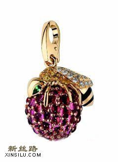 镶嵌黄色刚玉、沙弗莱石及黑漆的蜜蜂吊饰,正于红宝石花蕊采蜜,全球限量24只,96万5,000元