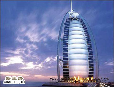 金帆船酒店是迪拜的骄傲,酒店坐落在离岸280米的小岛上,必须经过专用的桥才能到达。进入酒店后一切都是金碧辉煌,滚动电梯两旁是10几米高的水族箱,一边乘电梯一边就像漫游在海洋馆。这里的每一套客房都是复式,落地玻璃窗可以270度看海景。每个房间都在170平方米以上,卫生间超过25平方,设有巨大的按摩浴缸,大堂的地板上、房间的门把手、卫生间的配件都是不折不扣的黄金。 酒店拥有8辆劳斯莱斯来回机场接送,沐浴产品全部都是HERMES。到迪拜来的旅游者大多以王公贵族、商界精英、明星艺术家等社会名流居多。布莱德·彼特和安吉丽娜也是常客,他们会乘坐自己的私人飞机从美国直达迪拜,然后入住每晚需支付7000英镑的总统套房。茱丽还会在酒店的spa馆享受顶级的香熏精油按摩。总统套房极具奢华,不但有私人的宴客厅、带着旋转床的卧室、水流按摩浴缸、家庭影院,还有管家供他们24小时传唤。