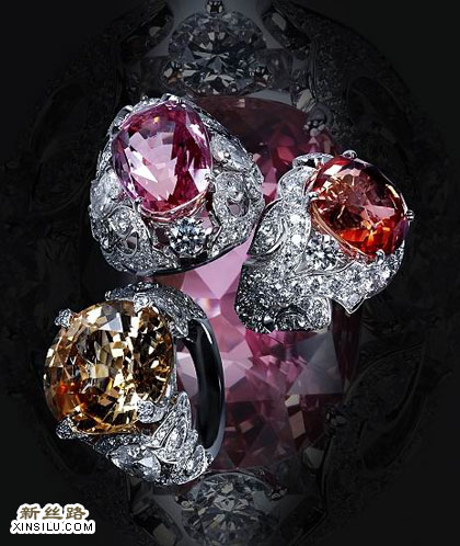高级珠宝系列蓝宝石钻石戒指,铂金镶嵌钻石,帕帕拉夏蓝宝石分别重达27.34克拉,22.4克拉和28.33克拉。埋藏于地底的珍稀宝石,经过能工巧匠的打磨散发熠熠光芒和诱惑美感,编织成连接神秘世界和珠宝珍品的纽带。