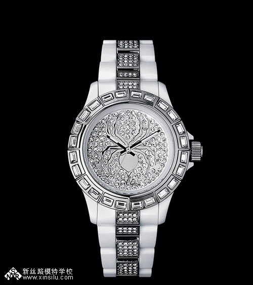 表面及表带镶嵌满黑水晶,表冠以单颗圆形宝石装饰。金色蜘蛛置于镶满白色水晶的表面,搭配饰有白色长形水晶的金色表圈及同样镶有相同材质的仿搪瓷胶带,闪烁动人。
