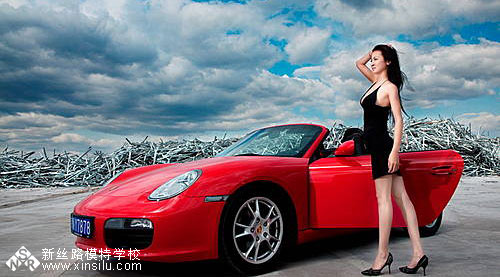 红色约会 美女演员与保时捷车影随行