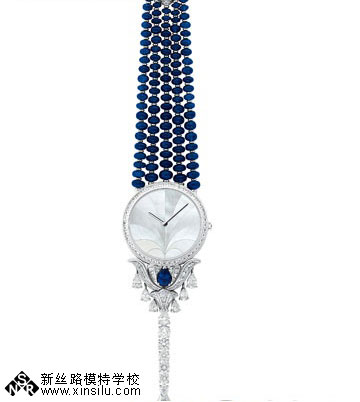 法国顶级珠宝品牌梵克雅宝的Vaux-le-Vicomte项链腕表,表壳镶嵌了枕形切割的钻石,并饰以蓝宝石圆珠来塑造宫殿内宏伟的小瀑布风景。喷泉由圆形、梨形及枕形切割的钻石,围绕华丽的梨形切割蓝宝石而成。喷泉旁的梨形切割钻石有如喷出的水花,营造完美的对称感,母贝表盘中更生动地描绘出另一瀑喷泉。更令人惊喜的是可拆卸的表带还能使这款瑰丽的时计摇身化作绝美的项链,全球限量一只的珍贵绝对值得拥有。