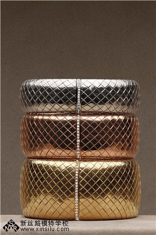 一系列令人眩目的手镯映衬了匠心设计与卓越工艺的相应关系。饰物手链时尚亮丽,单条的编织黄金手链,附有迷你托切罗(Torcello)开关扣和精致的编织Sfera球作点缀。另一条手链串以编织黄金及镶有白色碎钻石的白金而成;绽放耀眼光芒的白金Sfera缀饰亦镶嵌了白色碎钻。至于第三条手链就以两条编织黄金链串成,配上镶嵌钻石的白金托切罗(Torcello)开关。隽永和极赋视觉美感的手镯有编织黄金、白金和玫瑰金三款选择,开关上的钻石有点睛的效果。轻盈而可爱的编织黄金或白金饰扣手镯,白金手镯的饰扣上更有闪闪生辉的白色碎钻。