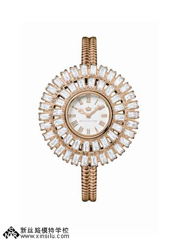 这款 Juicy Couture 手镯型腕表,犹如一枚闪烁璀璨的皇冠环抱你的手腕,小巧的镀金表壳被两行特大的方形晶石包围,表盘上典雅的罗马数字刻度,高贵大方,品牌独有的G &P 指针及皇冠标志,让配戴者每刻都可以沈醉于成为女王的幸福感觉。英文字母 G及 P分别代表品牌创办人 Gela and Pamela。