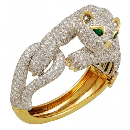 谈到温莎公爵的爱情,一定会想到1949年,卡地亚制作的一颗璀璨的152.35克拉凸圆形如乒乓球一样大的蓝宝石,一只镶钻猎豹高傲地站在蓝宝石上,毛皮上还点缀着凸圆形蓝宝石斑点的钻石胸针,而让她陶醉在此珠宝的女士,便是温莎公爵夫人,猎豹珠宝和他们的爱情故事有着密切联系。
