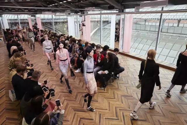 模特沿窗口行走,沐浴在午后阳光下,仿若悬浮于天空与作为秀场背景的华丽铸铁穹顶之间。