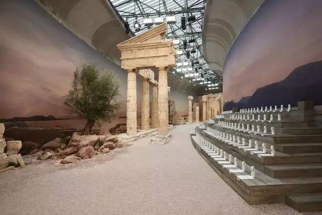 还记得2017秋冬那场秀,把秀场搬到了太空舱,最后一刻香奈儿五号卫星发射多么震撼。如今,Karl把我们带到了古希腊废墟的极乐世界。