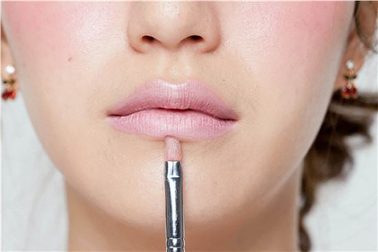STEP 8-描绘上粉红色的唇彩,让整体的好气色,立刻展现出来:使用了粉红色颊彩,在唇彩的选择上就挑选同色系的粉红色唇彩来达到一致性。建议选择的色调可以带点牛奶粉色会更协调。