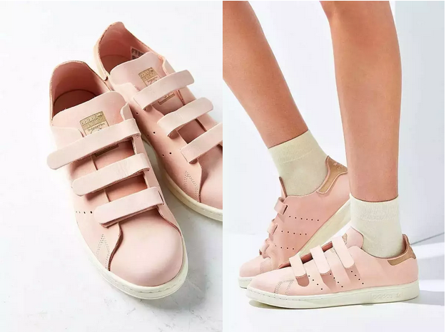 经典运动品牌中,Adidas为Urban Outfitters设计的Stan Smith魔术贴粉色运动鞋十分讨喜。把热门的白色款变成了干干净净的肉粉色,搭配浅金色尾标和米白鞋底,满满的小女生味道,踩上它立刻有了穿百褶短裙的冲动。