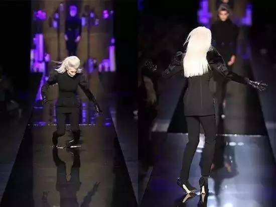 2014年7月9日86岁高龄老超模Daphne Selfe现身为Jean Paul Gaultier走秀。Daphne Selfe一头白发身穿黑色连身裤领衔走秀,却不慎在中途摔倒在T台上,还不赶紧叫救护车等什么呢!