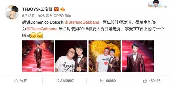 以当红小生王俊凯为例,他的个人微博有超过 2 千万粉丝,开秀前,Dolce&Gabbana 还使出大牌请明星的老套路——让王俊凯本人接管品牌官微,每一条经由他手发出的微博,均有超过 9000 条的留言,超过 1.5k 的转发,而在王俊凯本人的微博上,关于这场秀的微博被转发了超过 21 万次,6 万多条留言,超过 45 万次赞。