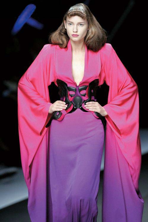 在这套系列中,全部使用的笔挺的剪裁,使其具有“威尔士亲王”男装的许多特点:严谨,突出肩部,结合传统服饰经验。本次Alexender McQueen系列的主题为“鸟”,在作品中有12次象征性的夸张表现,以及日式的腰带,梯形的上身,成型的臀部设计等等。然而,对于设计师来说,这次的重点又在于避免重复自己,减少了贝壳类硬性的造型,突出了鸟翅、蝴蝶、蝉翼的折叠效果,营造另一种浪漫的游戏潮流。