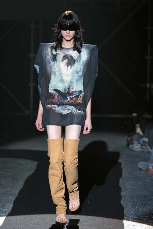这次,Martin Margiela还是没有出现,也许他的秀场根本是他沉醉于玩神秘的最佳舞台。铠甲型肩托,锋利指向两边,穿着者因具有了侵略性而显得孤独;面无表情的模特被蒙上眼睛——在表现后工业时代生存的特质上,无疑Martin Margiela具有他先天的捕捉力。黑灰白三色是主调,偶以金属质地银灰打点光泽,很明显,又一个神秘主义和未来主义的痴狂者。